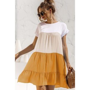 $29.50Lightweight sheer woven fabric shapes this dress with flutter short sleeve, and an elastic fitted waist tops the flared mini skirt with ruffled hem. Lined.