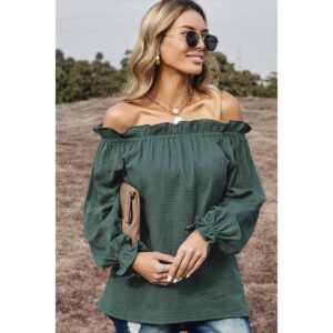 $25.50Lightweight woven fabric shapes this top with a ruffled trim off the shoulder neckline, loose long sleeves with elasticized ruffled cuffs, a relaxed bodice ends in a wide cut hem.