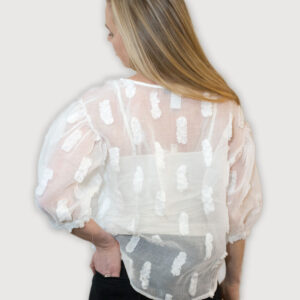 Lightweight woven fabric shapes this top with a ruffled trim off the shoulder neckline, loose long sleeves with elasticized ruffled cuffs, a relaxed bodice ends in a wide cut hem.